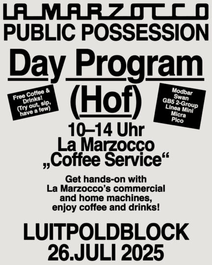 Day Time Programm 10 - 14h (Luitpoldblock Hof) La Marzocco "Coffee Service" Get hands-on with La Marzocco's commercial and home machines, enjoy free →