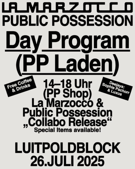 Day Time Program (Public Possession Shop) La Marzocco & Public Possession "Collabo Release" Deejays Sophie Pschorr & Luxus Special Item available Free Coffee →