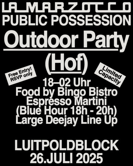 La Marzocco & Public Possession Party Large Deejay Line Up Food by Bingo Bistro Espresso Martini (Blue Hour 18h - 20h) Um →